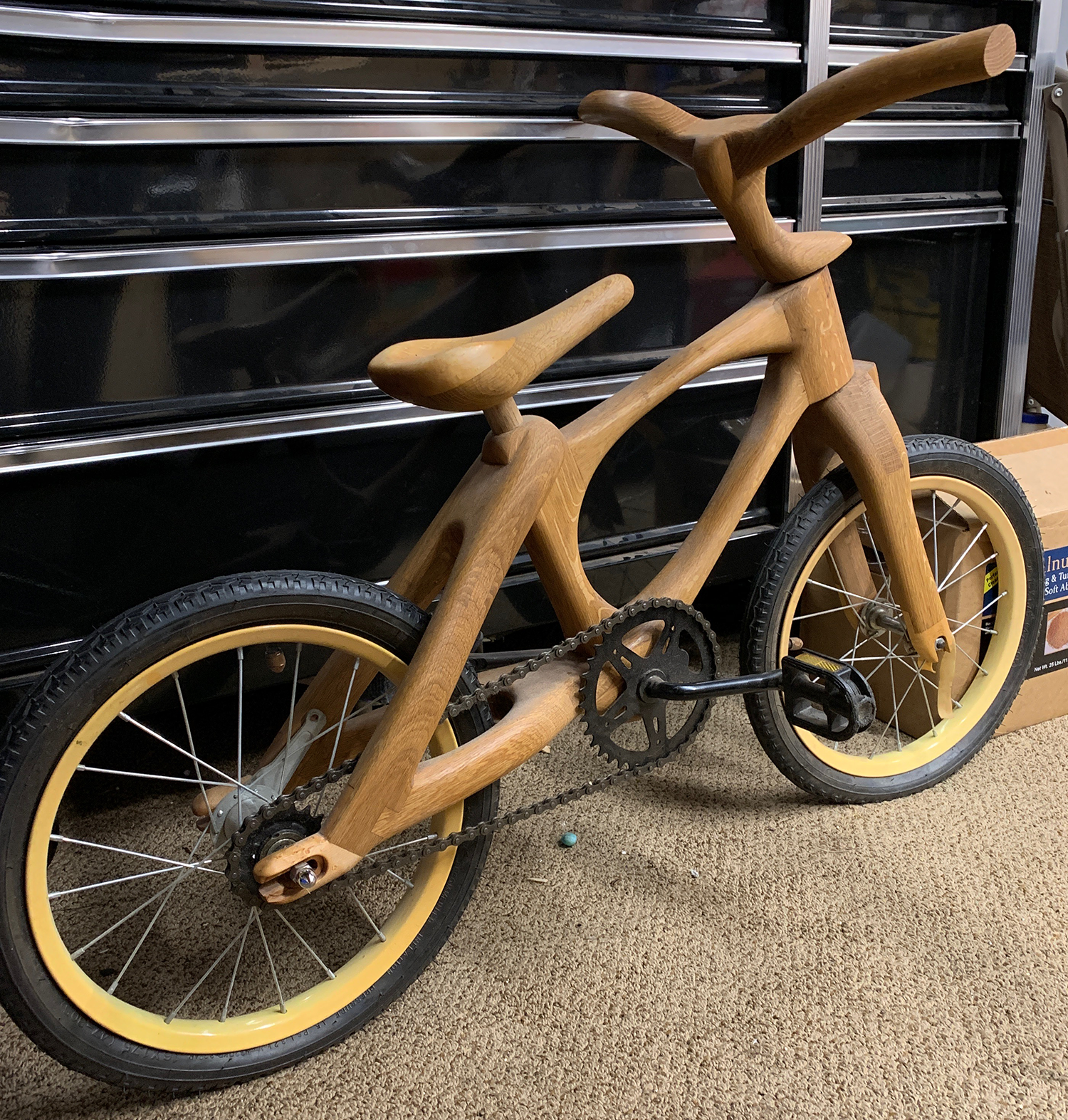The bike he ultimately built was made in our dining room. It was child-sized, but beautifully complex. He carved it by hand and used traditional joinery and no hardware at all. Every piece fit together the way wood wants to fit together.